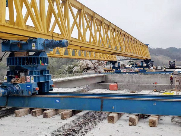 JQ900A型架橋機架梁作業為跨一孔簡支式架梁,由YL900型運梁車運梁至架橋機尾部喂梁,起重小車吊梁拖拉取梁,空中微調箱梁位置就位,架橋機采用液壓驅動輪胎走行,步履縱移過孔作業方式。