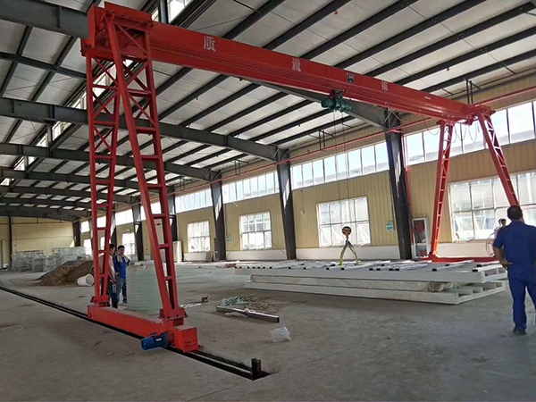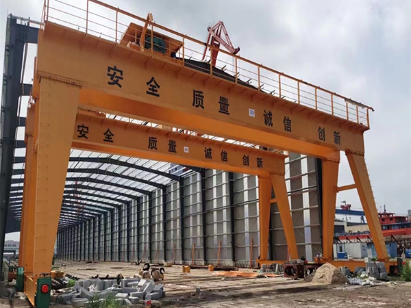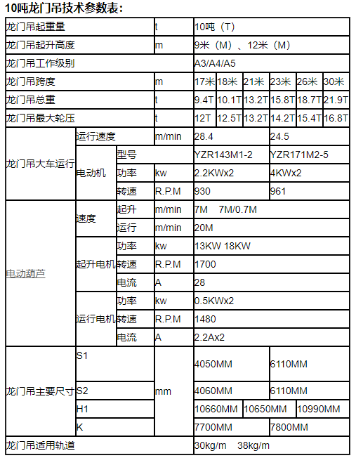 按用途形式一、普通龍門起重機軌道門式起重機這種起重機多采用箱型式和桁架式結構,用途最廣泛。可以搬運各種成件物品和散狀物料,起重量在100噸以下,跨度為4~39米。用抓斗的普通門式起重機工作級別較高。普通門式起重機主要是指吊鉤、抓斗、電磁、葫蘆門式起重機,同時也包括半門式起重機。二、水電站龍門起重機主要用來吊運和啟閉閘門,也可進行安裝作業(yè)。起重量達80~500噸,跨度較小,為8~16米;起升速度較低,為1~5米/分。這種起重機雖然不是經常吊運,但一旦使用工作卻十分繁重,因此要適當提高工作級別。三、造船龍門起重機用于船臺拼裝船體,常備有兩臺起重小車:一臺有兩個主鉤,在橋架上翼緣的軌道上運行;另一臺有一個主鉤和一個副鉤,在橋架下翼緣的軌道上運行,以便翻轉和吊裝大型的船體分段。起重量一般為100~1500噸;跨度達185米;起升速度為 2~15米/分,還有0.1~0.5米/分的微動速度。四、集裝箱龍門起重機用于集裝箱碼頭。拖掛車將岸壁集裝箱運載橋從船上卸下的集裝箱 軌道龍門吊運到堆場或后方后,由集裝箱龍門起重機堆碼起來或直接裝車運走,可加快集裝箱運載橋或其他起重機的周轉。可堆放高3~4層、寬6排的集裝箱的堆場,一般用輪胎式,也有用有軌式的。集裝箱龍門起重機與集裝箱跨車相比,它的跨度和門架兩側的高度都較大。為適應港口碼頭的運輸需要,這種起重機的工作級別較高。起升速度為8~10米/分;跨度根據需要跨越的集裝箱排數(shù)來決定,最大為60米左右相應于20英尺、30英尺、40英尺長集裝箱的起重量分別約為20噸、25噸和30噸。