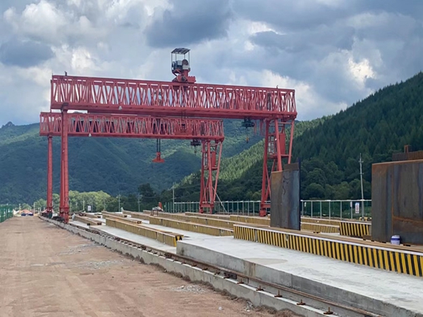 提梁機既可兩臺配合抬吊預制梁,也可以單臺起重機配雙吊具起吊預制梁,兩臺同時起重的提梁機各自的起重量一般為450噸,單臺起重的提梁機起重量通常可達900噸。它配置支腿行走、天車行走及天車起吊設備,可以實現全方位機械化動作。主要用于將預制梁從制梁臺提吊至存梁臺位,預制梁養護完成后將其從存梁臺位吊運到運梁車上。作為起重設備完成架橋機的組裝和拆卸。還用于架設墩身不高的旱橋。