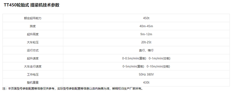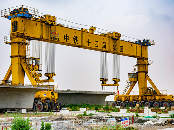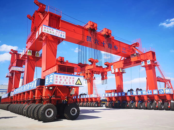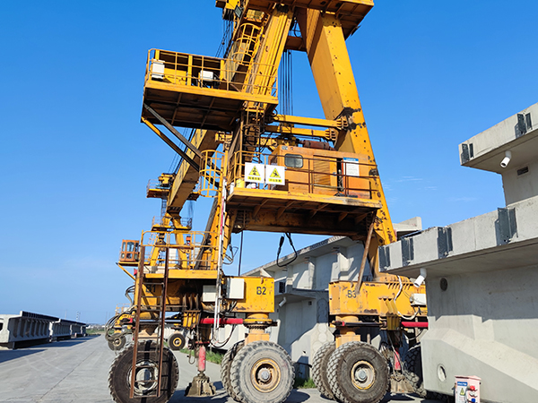 提梁機既可兩臺配合抬吊預制梁,也可以單臺起重機配雙吊具起吊預制梁,兩臺同時起重的提梁機各自的起重量一般為450噸,單臺起重的提梁機起重量通常可達900噸。它配置支腿行走、天車行走及天車起吊設備,可以實現全方位機械化動作。主要用于將預制梁從制梁臺提吊至存梁臺位,預制梁養護完成后將其從存梁臺位吊運到運梁車上。作為起重設備完成架橋機的組裝和拆卸。還用于架設墩身不高的旱橋。